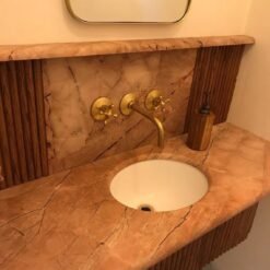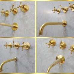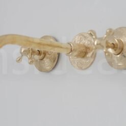 Unlacquered brass vintage wall mounted bathroom faucet with gold engraved finish & traditional handles
