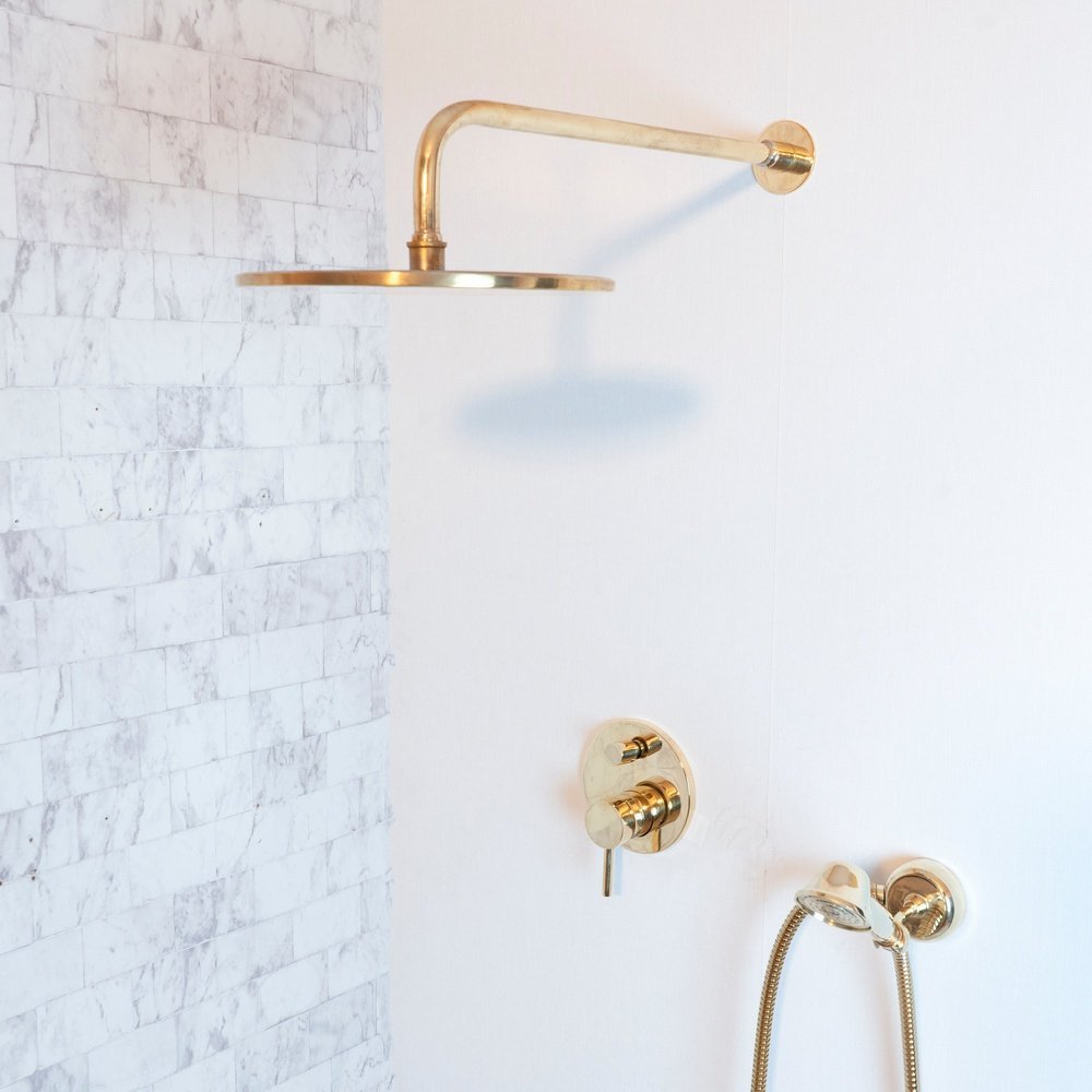 Featuring charming details, this Antique Brass Concealed Shower Head With Arm And Hand Shower is perfect for a classic-inspired space. Flared and Handcrafted details and your choice of premium finish complete its graceful silhouette.
