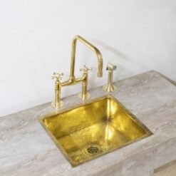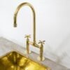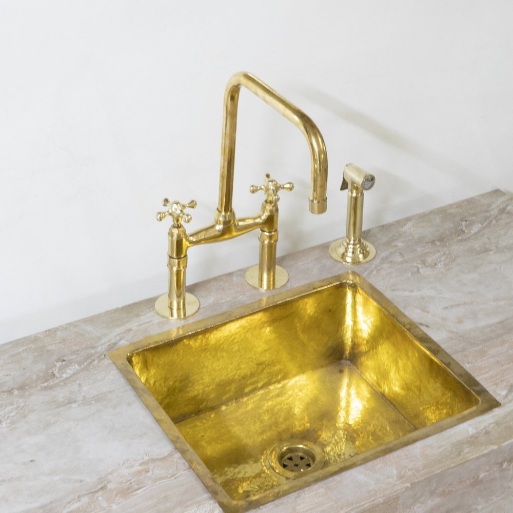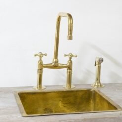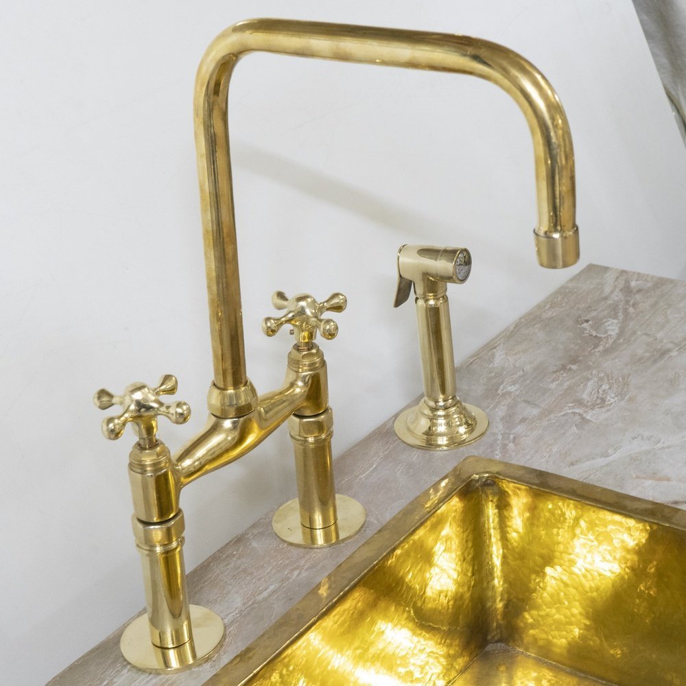 Give your kitchen a modern edge with the Brass Bridge Faucet. Featuring cross handles, this piece’s elegant gooseneck shape extends over your sink for a streamlined look and feel. Made of brass, it boasts a durable finish that is available in a variety of colors to complement your decor. it includes a water-efficient and eco-friendly aerator.