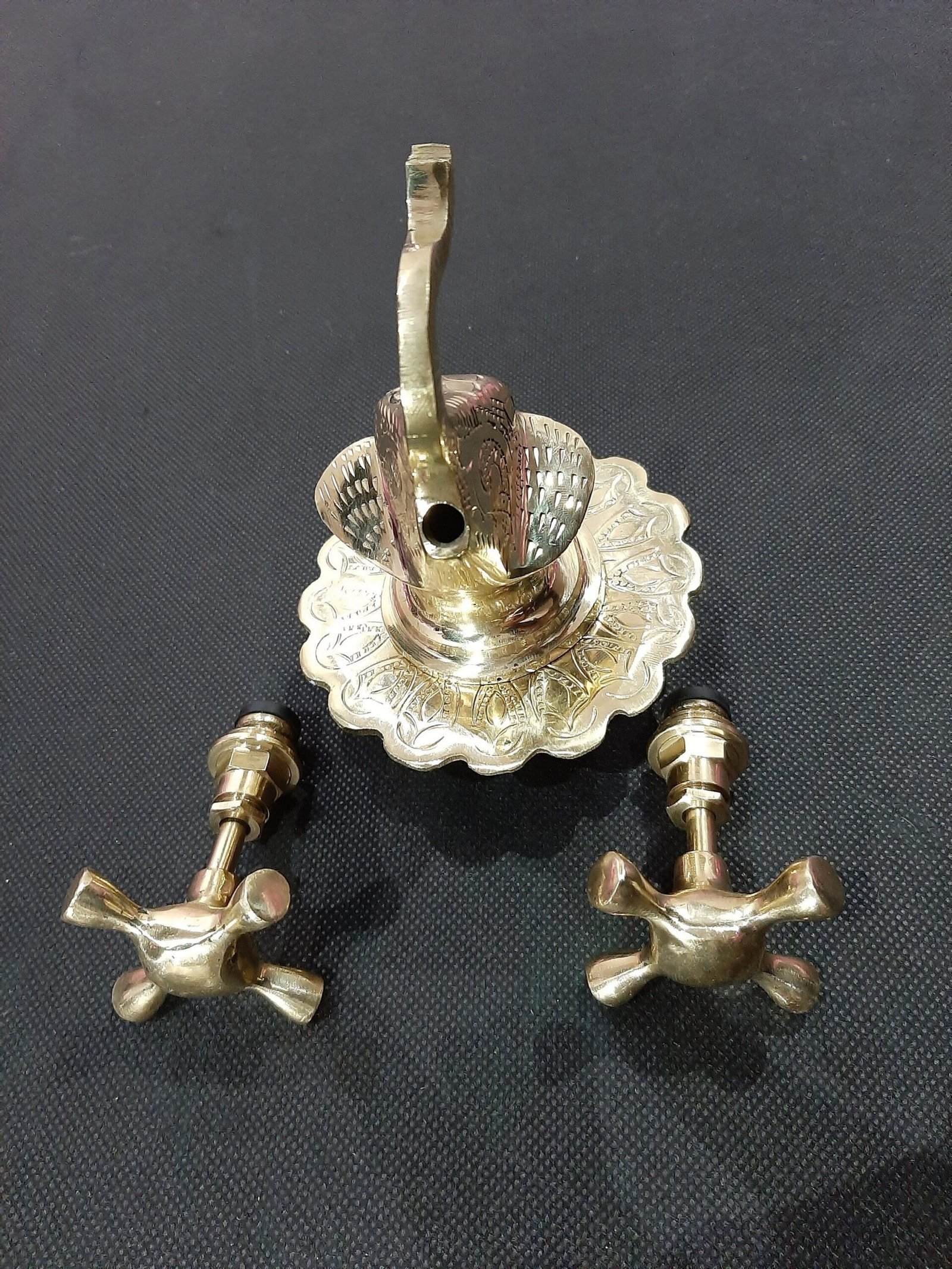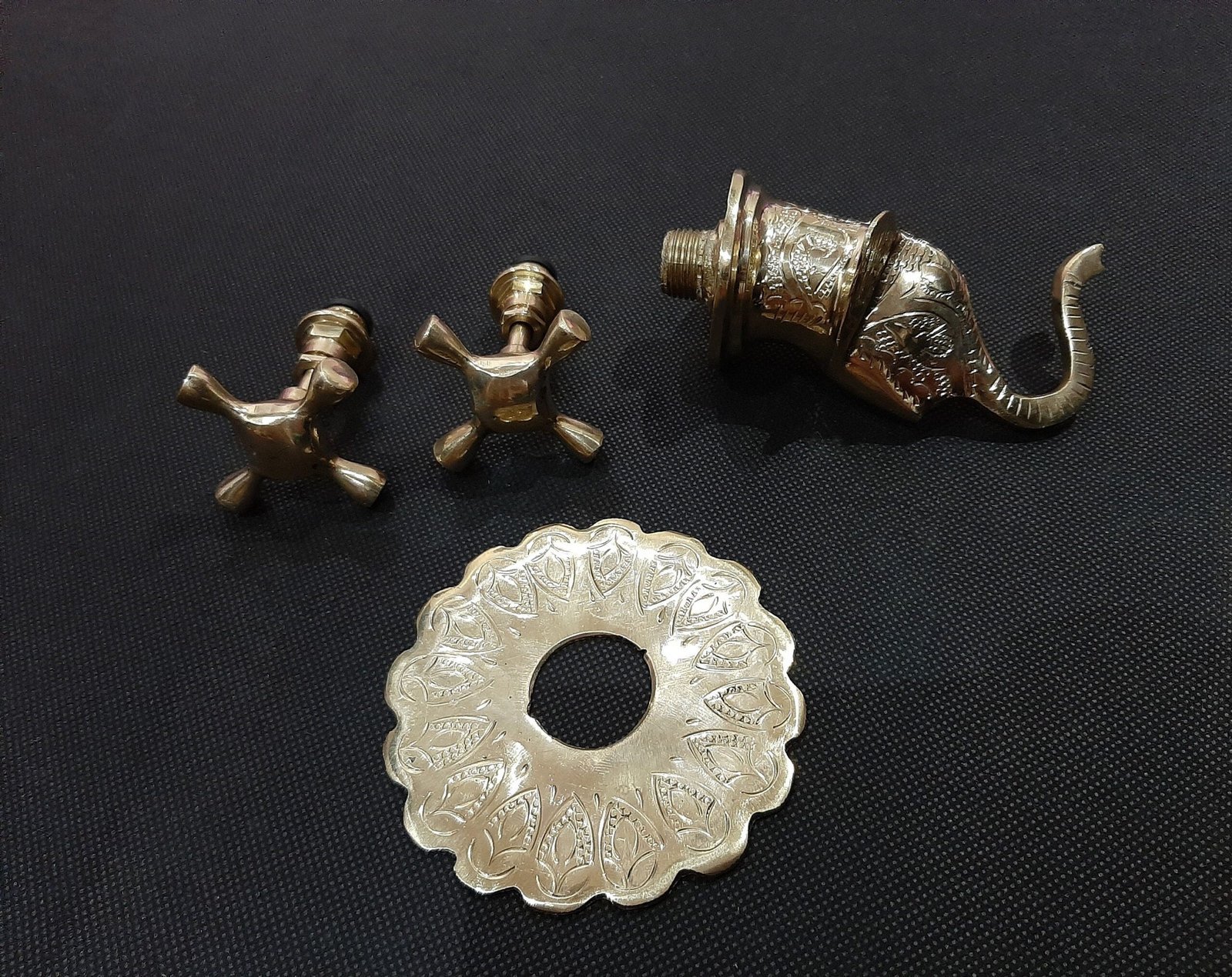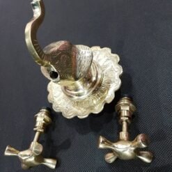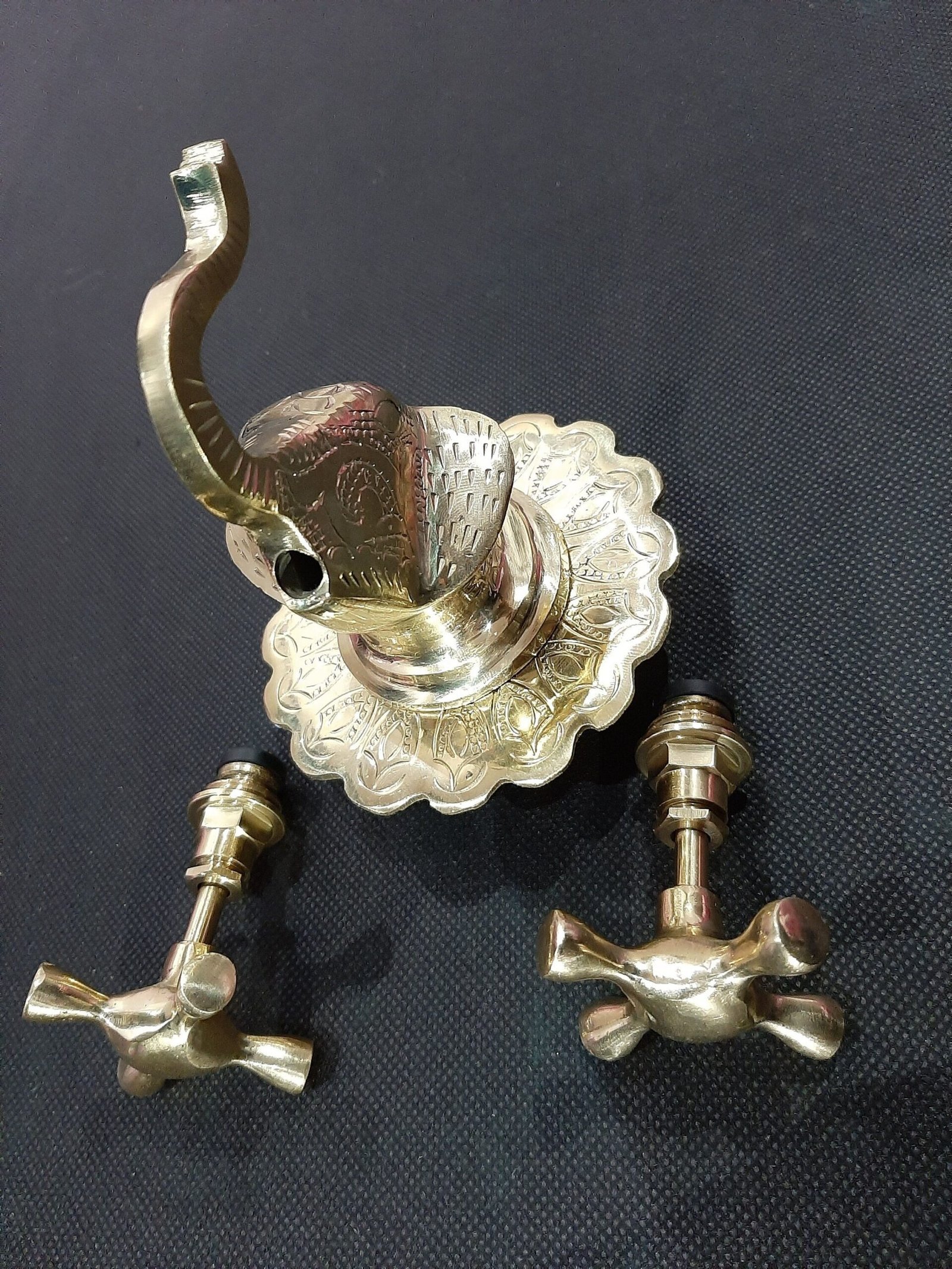 beautifully decorated faucet with the face of an elephant with two handles for cold and hot water