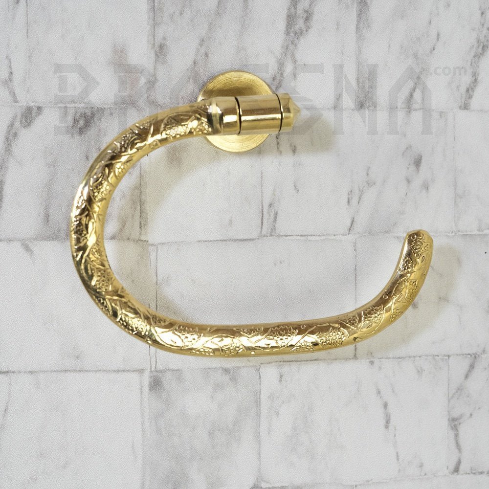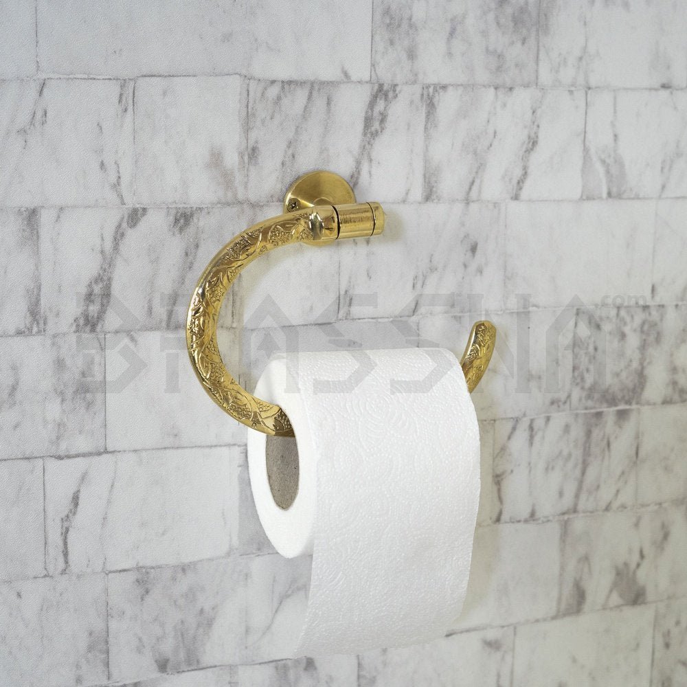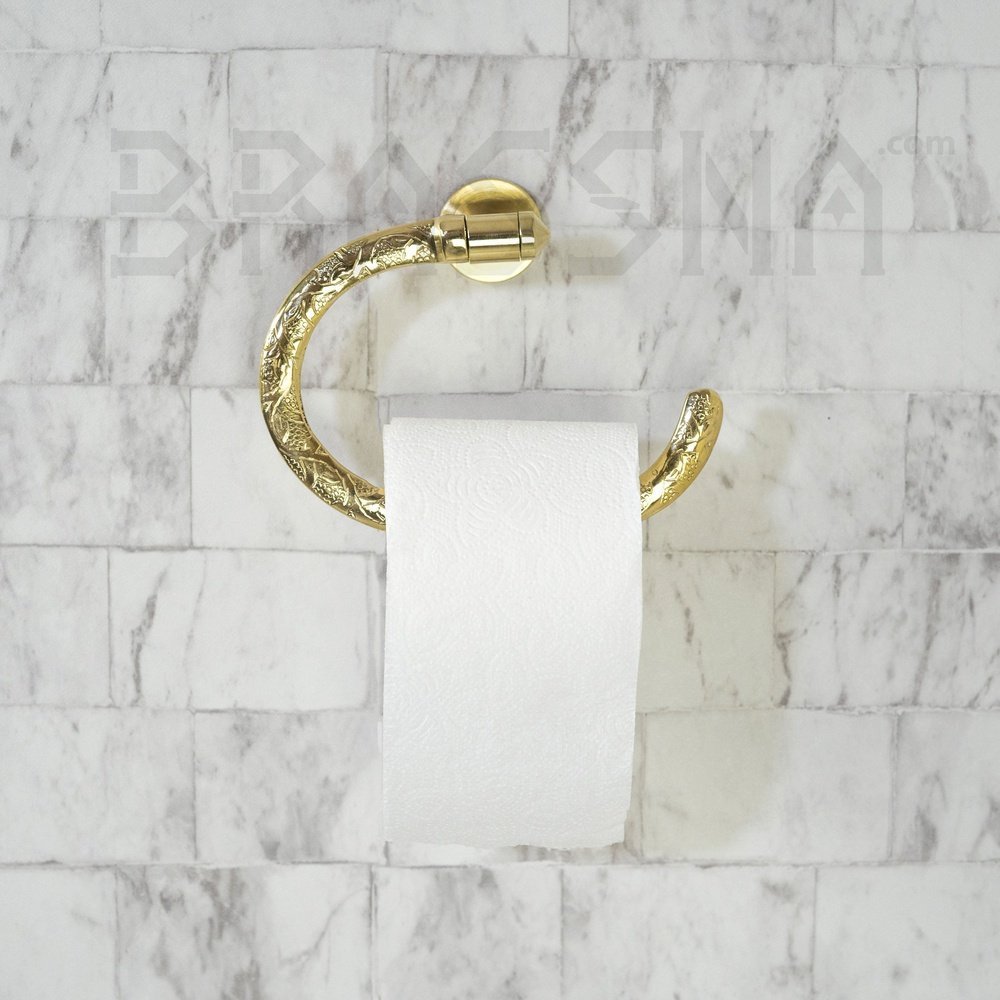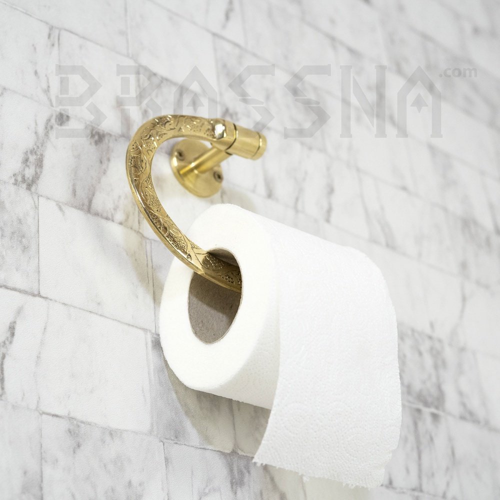 This handcrafted engraved unlacquered brass toilet paper holder will make a great addition to your bathroom organization and provide a decorative place to keep your hand towels. The delightful shape will add a touch of modern elegance to your traditionally styled bathroom.
