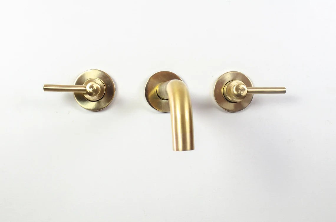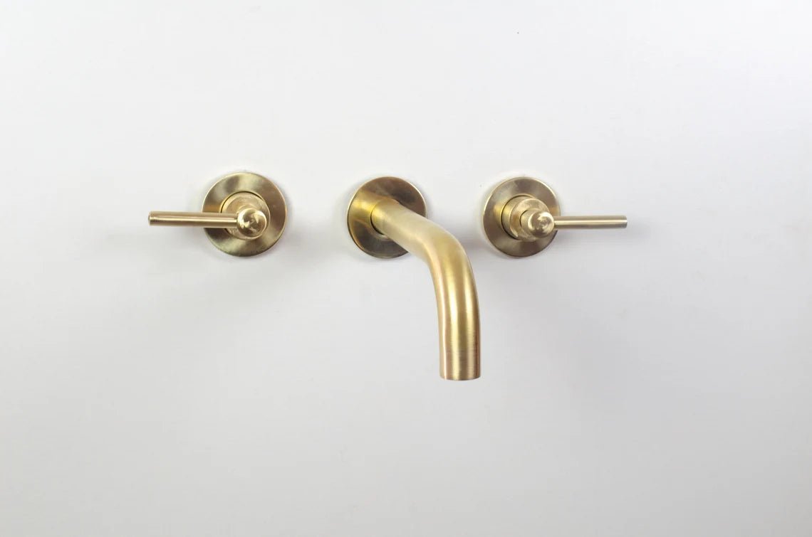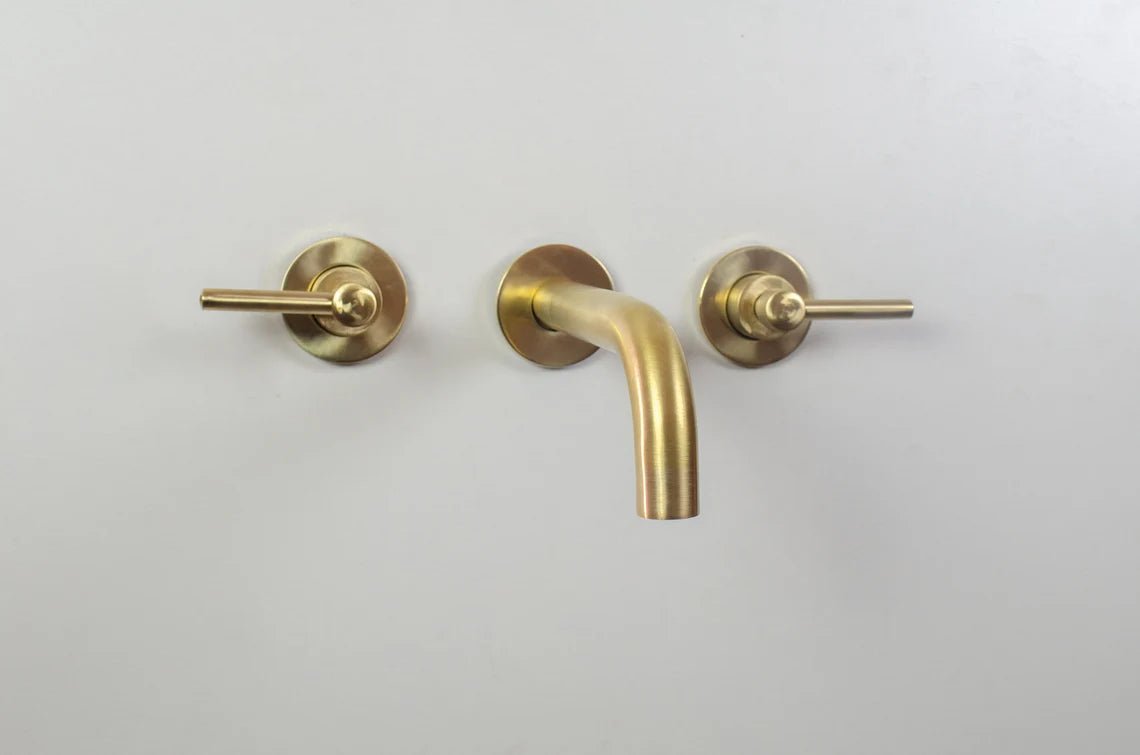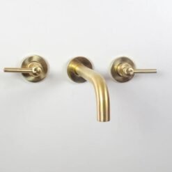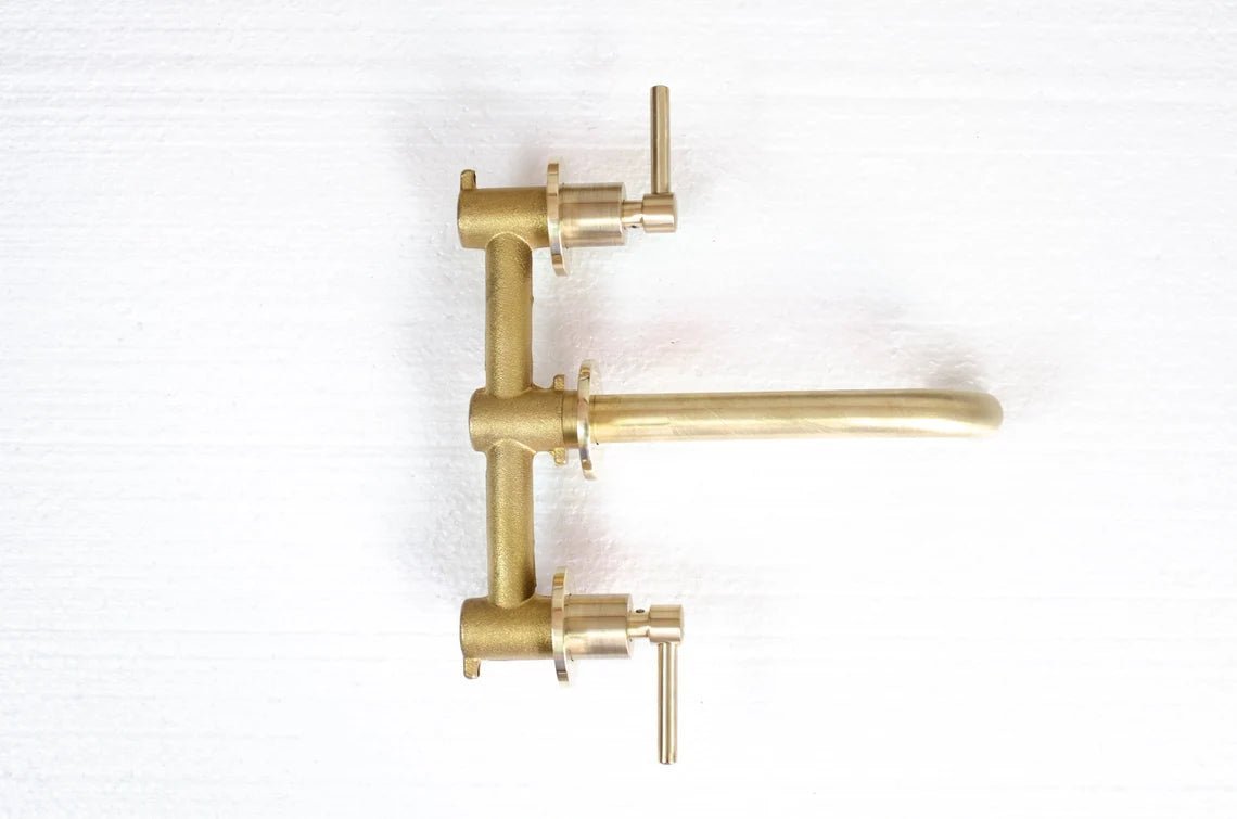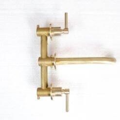 Brushed brass wall mounted bathroom vessel sink faucet with simple lever handles