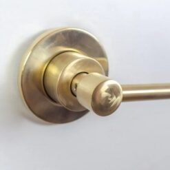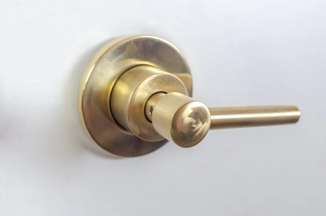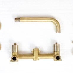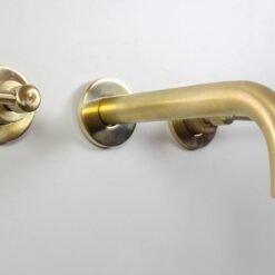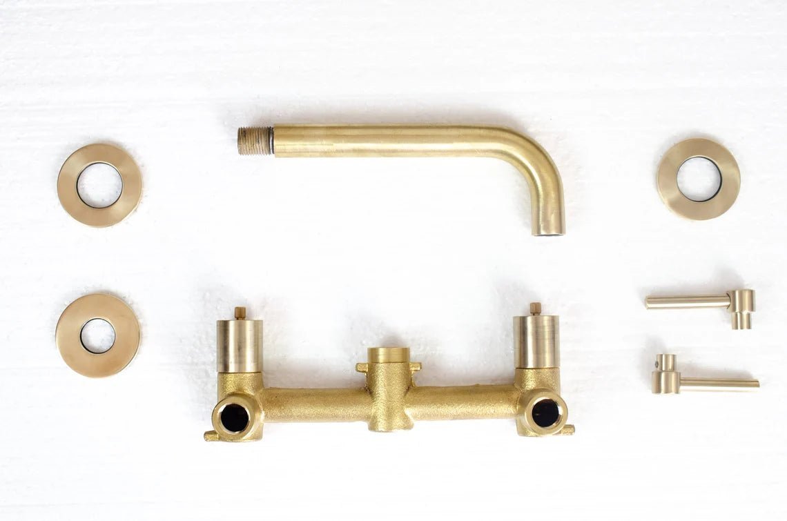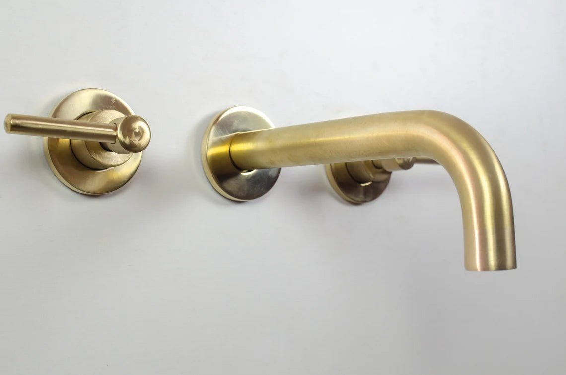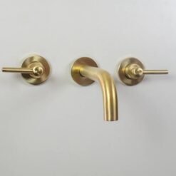 Brushed brass wall mounted bathroom vessel sink faucet with simple lever handles