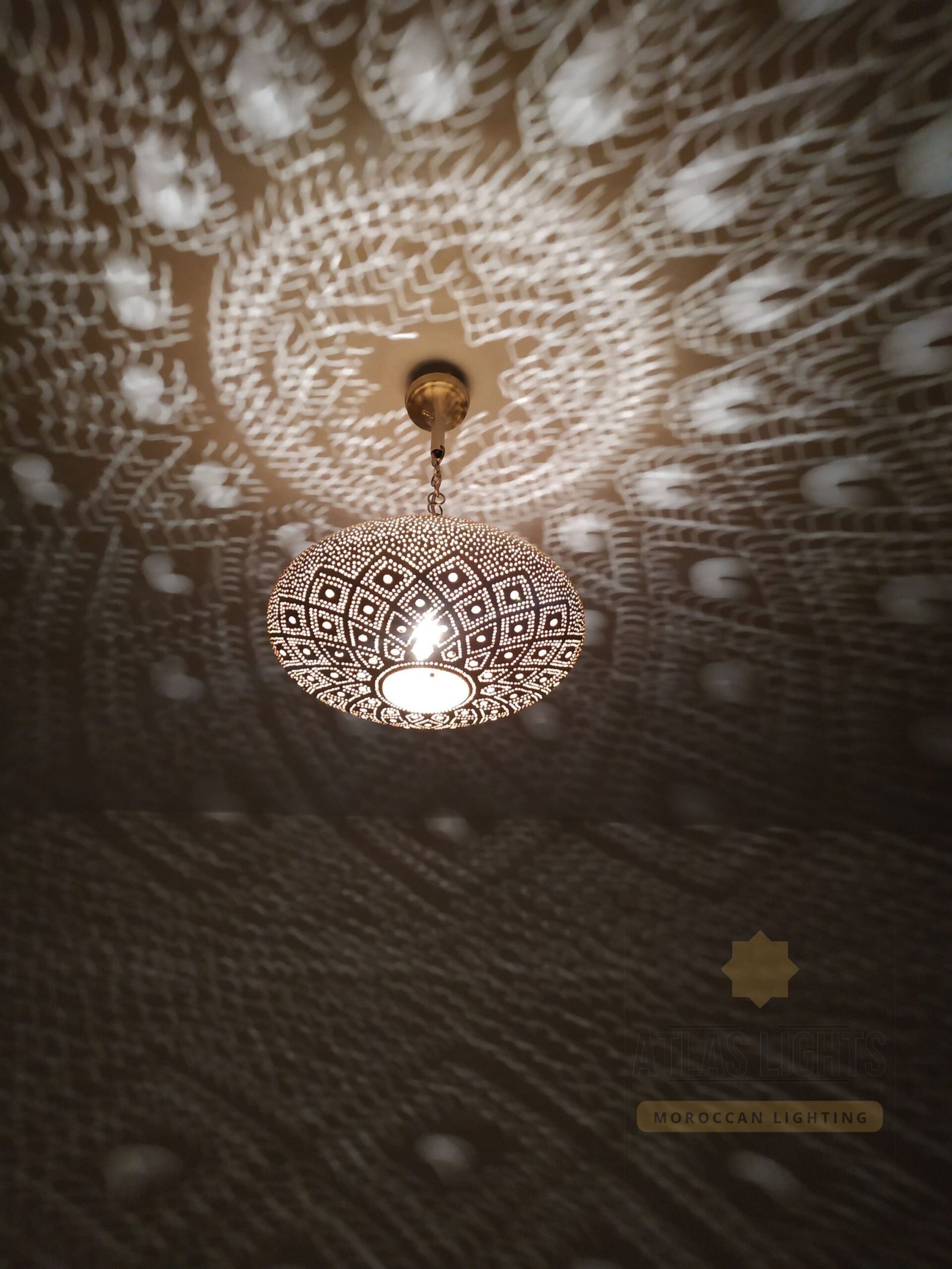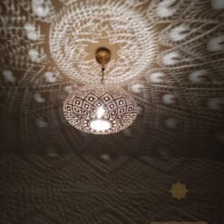 Beautiful Moroccan Style Lantern. Our graceful Moroccan style shade lantern is made in Morocco by talented artisans; A suspension in the form of an open pressed ceiling lamp about 13.7″ and 21″ in diameter, which will add a touch of craftsmanship to your interior by diffusing a beautiful Moroccan lamp shades on the ceiling as well as the walls, and to illuminate the room.