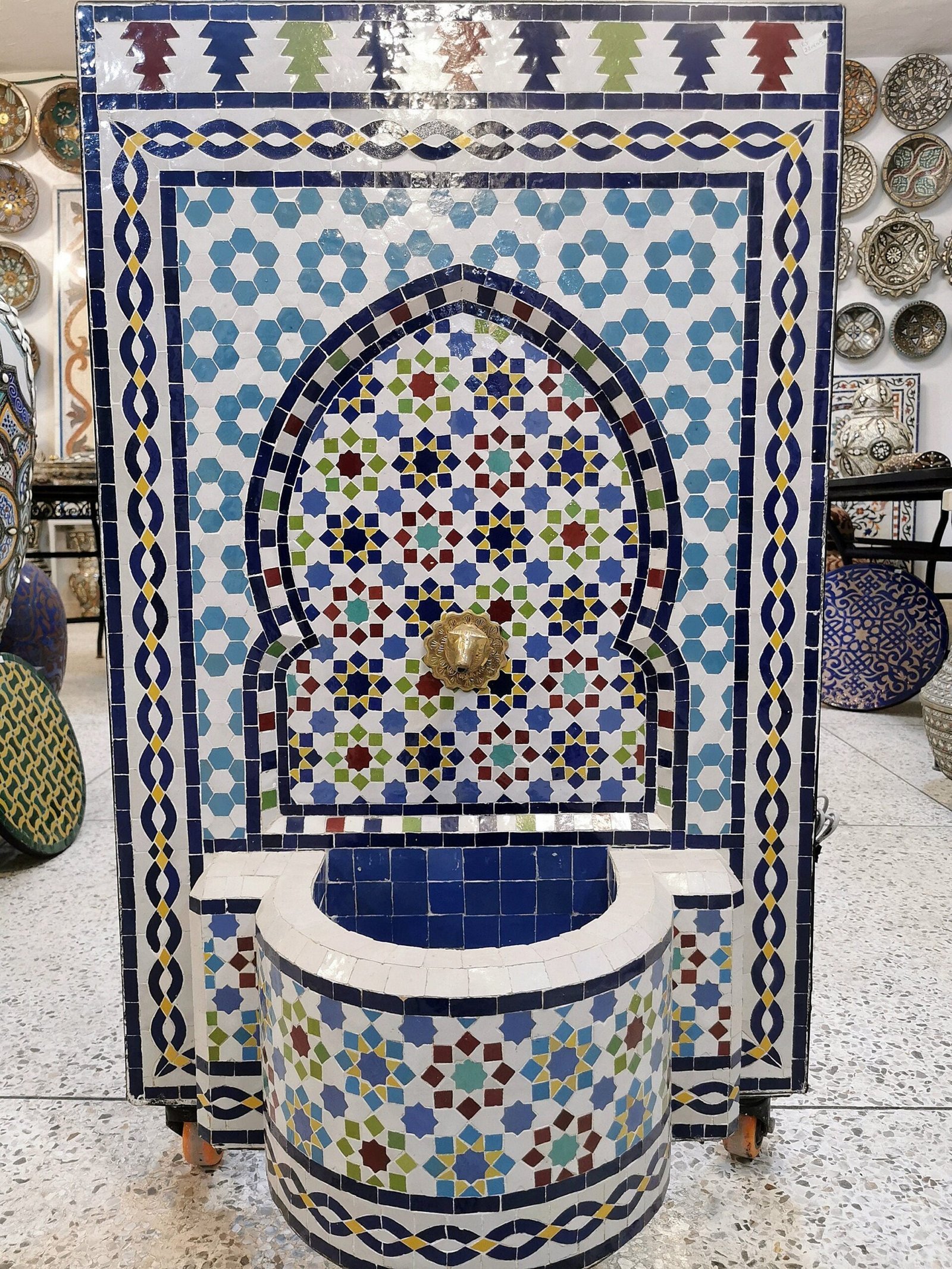 this amazing traditional Fountain was handcrafted by A professional worker, it represents the cultural diversity of Moroccan handcrafts and that is because of its design, material and the colors used at the surface of the table, the height of this amazing piece of art is 55 cm with a width of 40 cm and a possibility of personal customization. by obtaining such objects you would be helping a dying craft to flourish again so that contact between the past and the present would never die not mentioning the happiness it would bring to poor workers on fields like this .