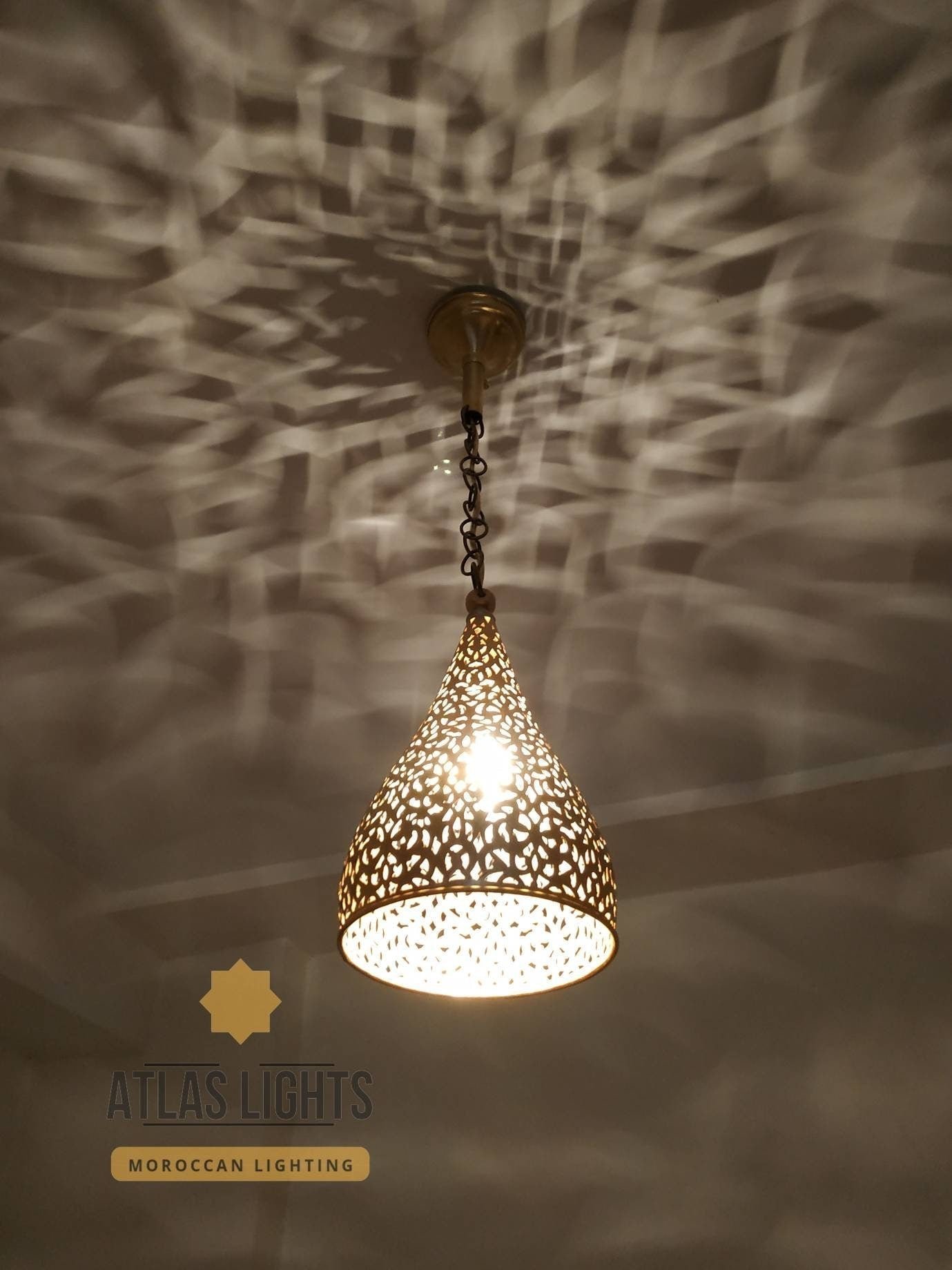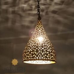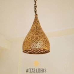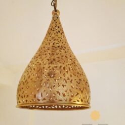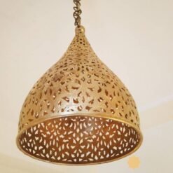 Our antique brass Engraved pendant lamp is perfect for smaller spaces. Its shape allows for plenty of clean light to project as well as a subtle patterned light to emit through its floral design. This small cone shaped Moroccan ceiling light has been pierced by hand, using a fine blade fretsaw tool to create intricate patterns that really catch the eye.