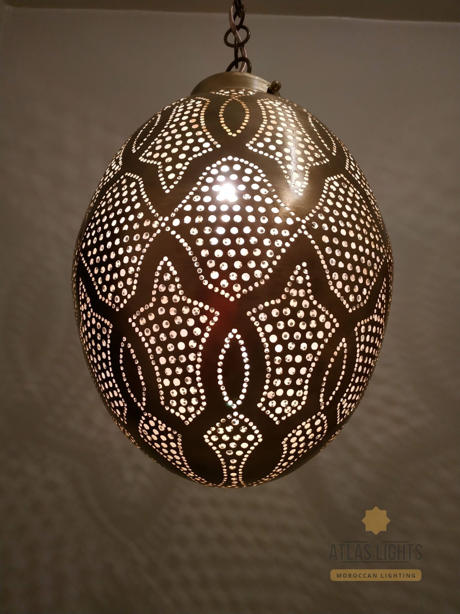 This Moroccan Style Hanging Light Lantern is made of brass will reflect amazing shades to your wall, Delicately handmade with our artisans’ ‘punching’ technique, our Moroccan Closed Egg vintage hanging ceiling light Moroccan pendant light is contemporary and emits a sparkling light through each of its punched circles which will add a touch of craftsmanship to your interior by diffusing a beautiful Moroccan lamp shades on the ceiling as well as the walls, and to illuminate the room.