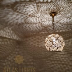 Delicately handmade with our artisans’ ‘punching’ technique, our Moroccan vintage hanging ceiling light Moroccan pendant light is contemporary and emits a sparkling light through each of its punched circles which will add a touch of craftsmanship to your interior by diffusing a beautiful Moroccan lamp shades on the ceiling as well as the walls, and to illuminate the room.