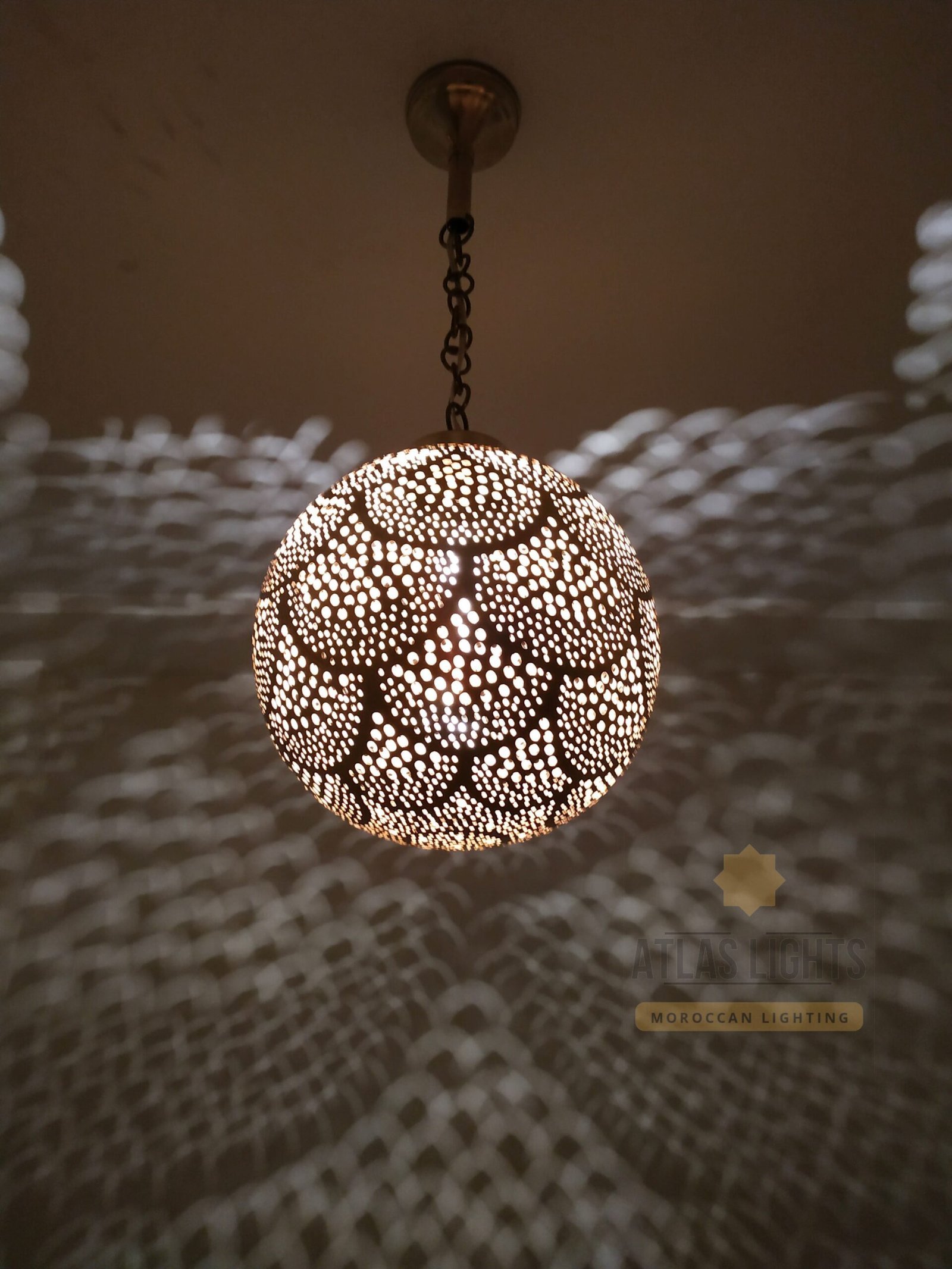 Delicately handmade with our artisans’ ‘punching’ technique, our Moroccan vintage hanging ceiling light Moroccan pendant light is contemporary and emits a sparkling light through each of its punched circles.