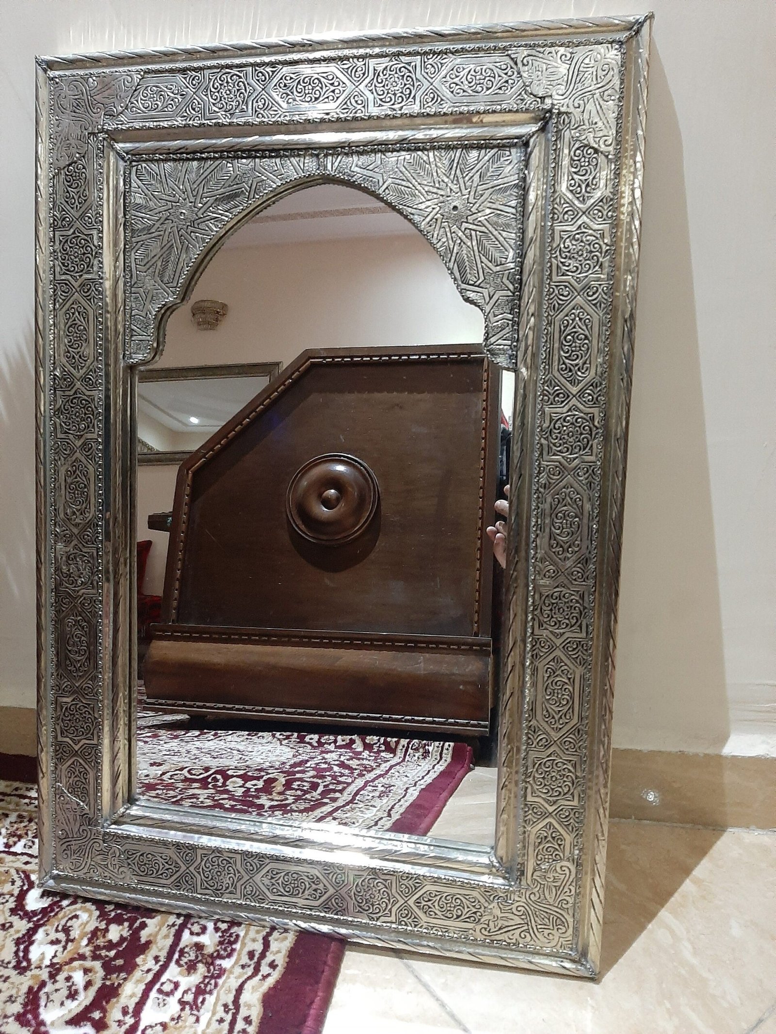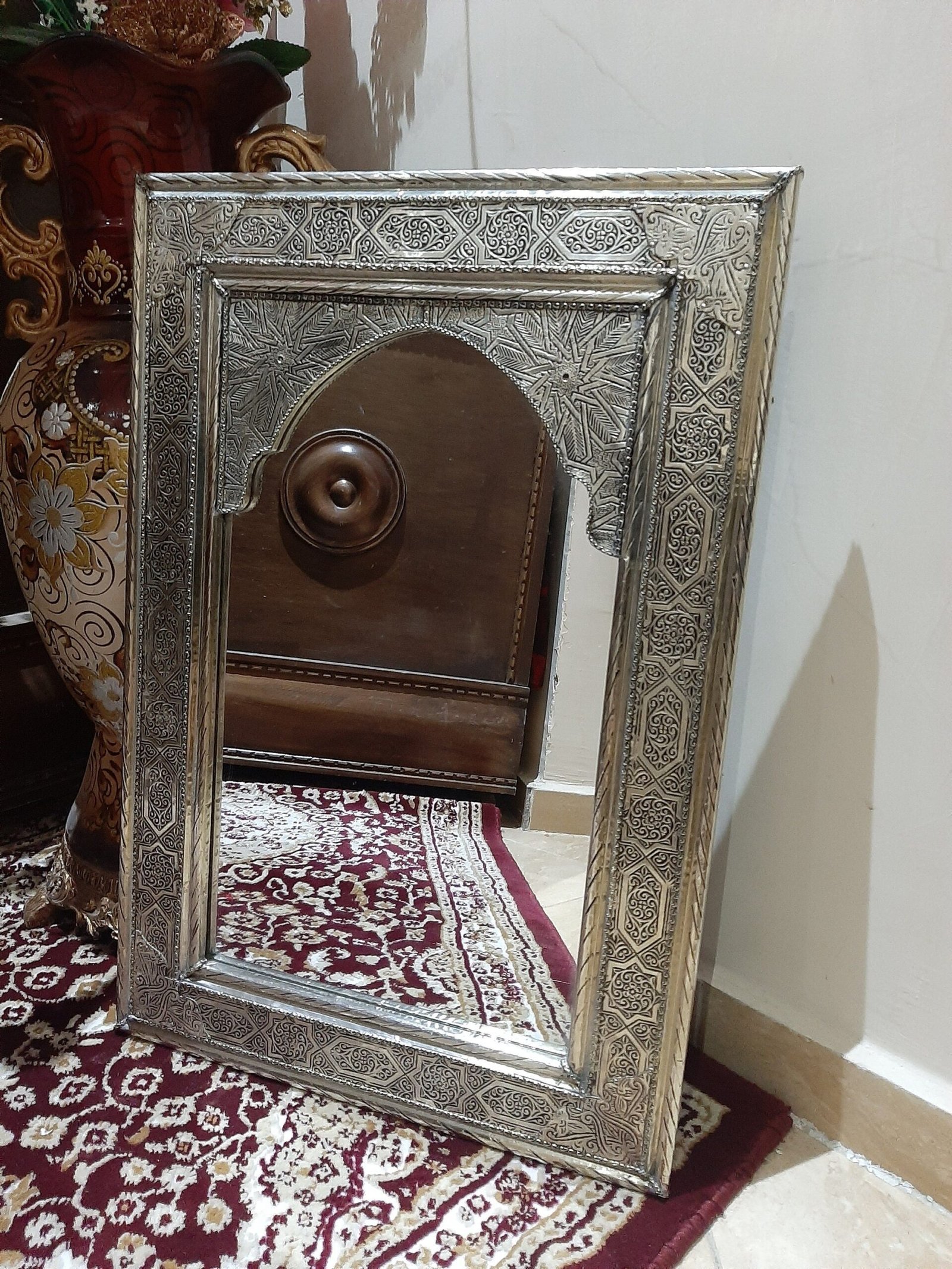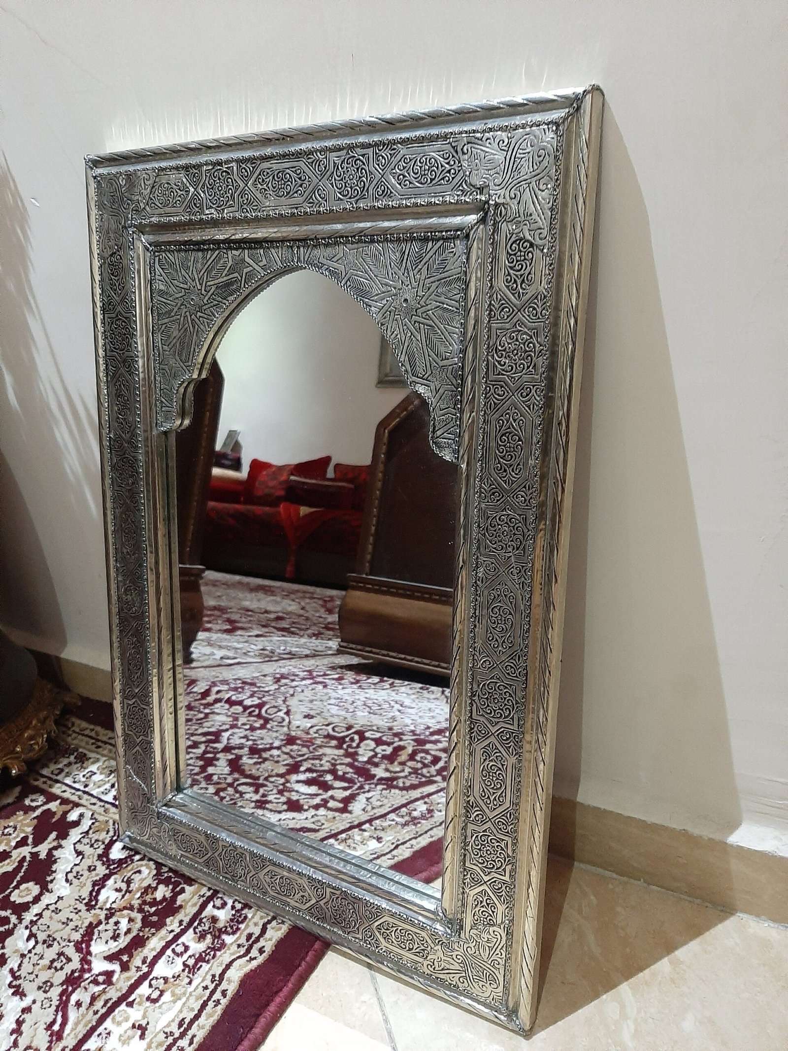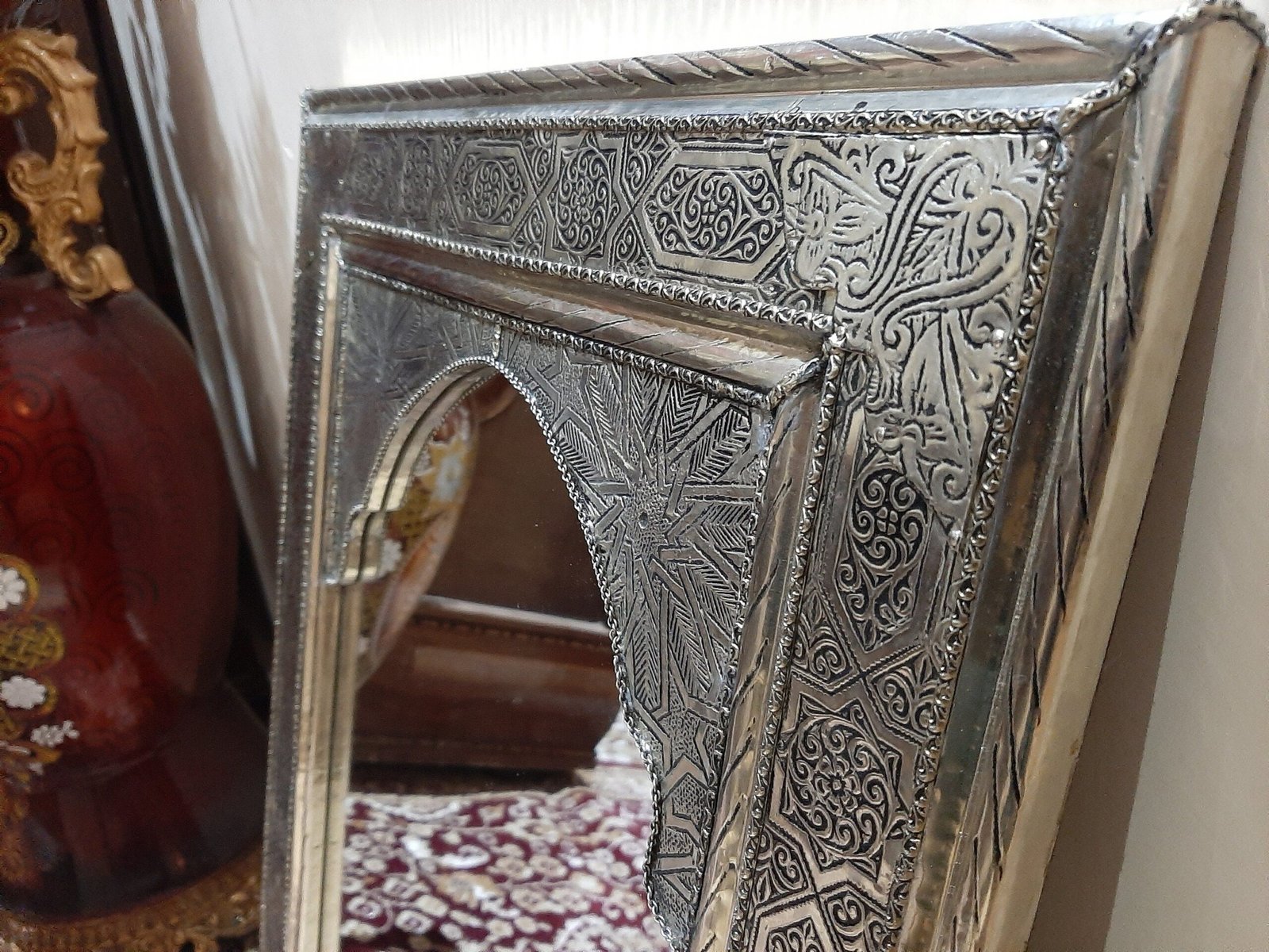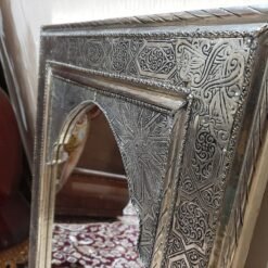 Silver color, a mirror for wall, Engraved metal.
