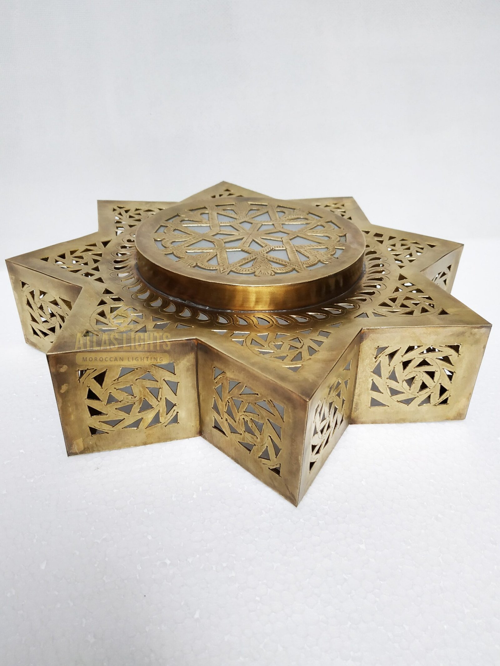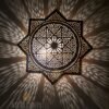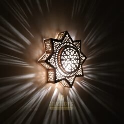 Inspired by the wall lamps in the ancient palaces of Morocco, this brass wall mounted lamp adds a sense of majesty to its environs. Its corset shape is decorated with our craftsmen’s’ hand pierced geometric design on the main body as well as a floral and lattice design on its bottom tiers. The crown of the lamp features a discreet dome silhouette rendered with a small hand etched design and brass beading.
