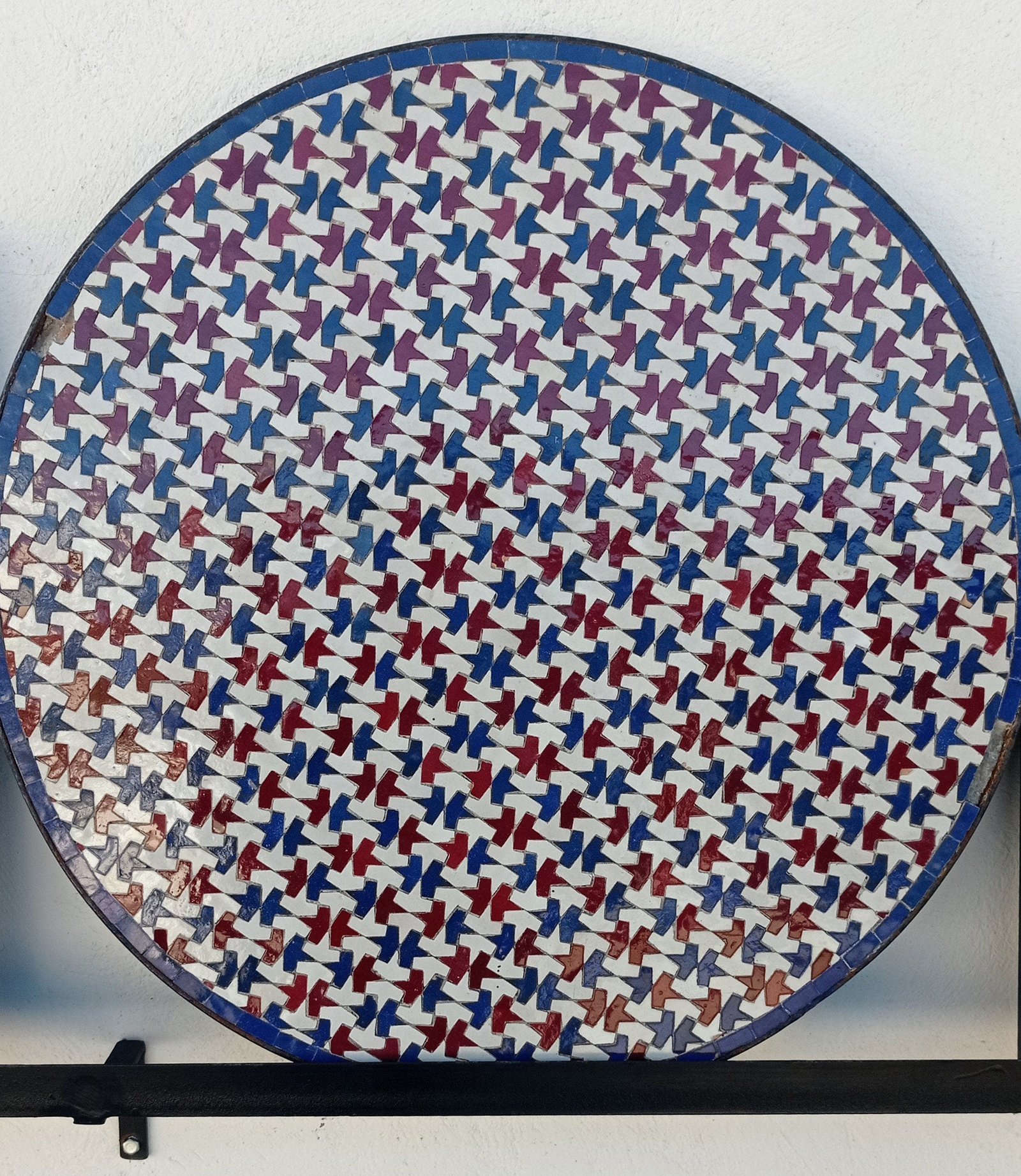 The mosaic plate is composed of individual ornaments made of Moroccan tile mosaics, which are cemented into an iron frame. The look and feel are incomparable. The frame of the table is made of wrought iron and has been treated with a transparent varnish. The mosaic plate, manufactured with art, is placed on the frame and does not require any additional fixing because of its high weight.