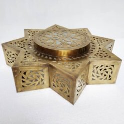Inspired by the wall lamps in the ancient palaces of Morocco, this brass wall mounted lamp adds a sense of majesty to its environs. Its corset shape is decorated with our craftsmens’ hand pierced geometric design on the main body as well as a floral and lattice design on its bottom tiers. The crown of the lamp features a discreet dome silhouette rendered with a small hand etched design and brass beading.